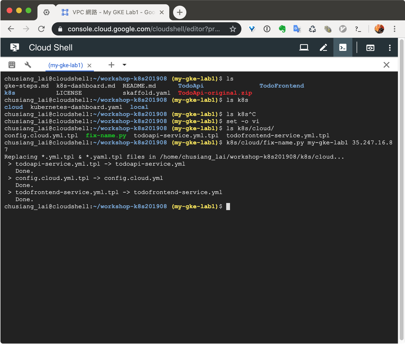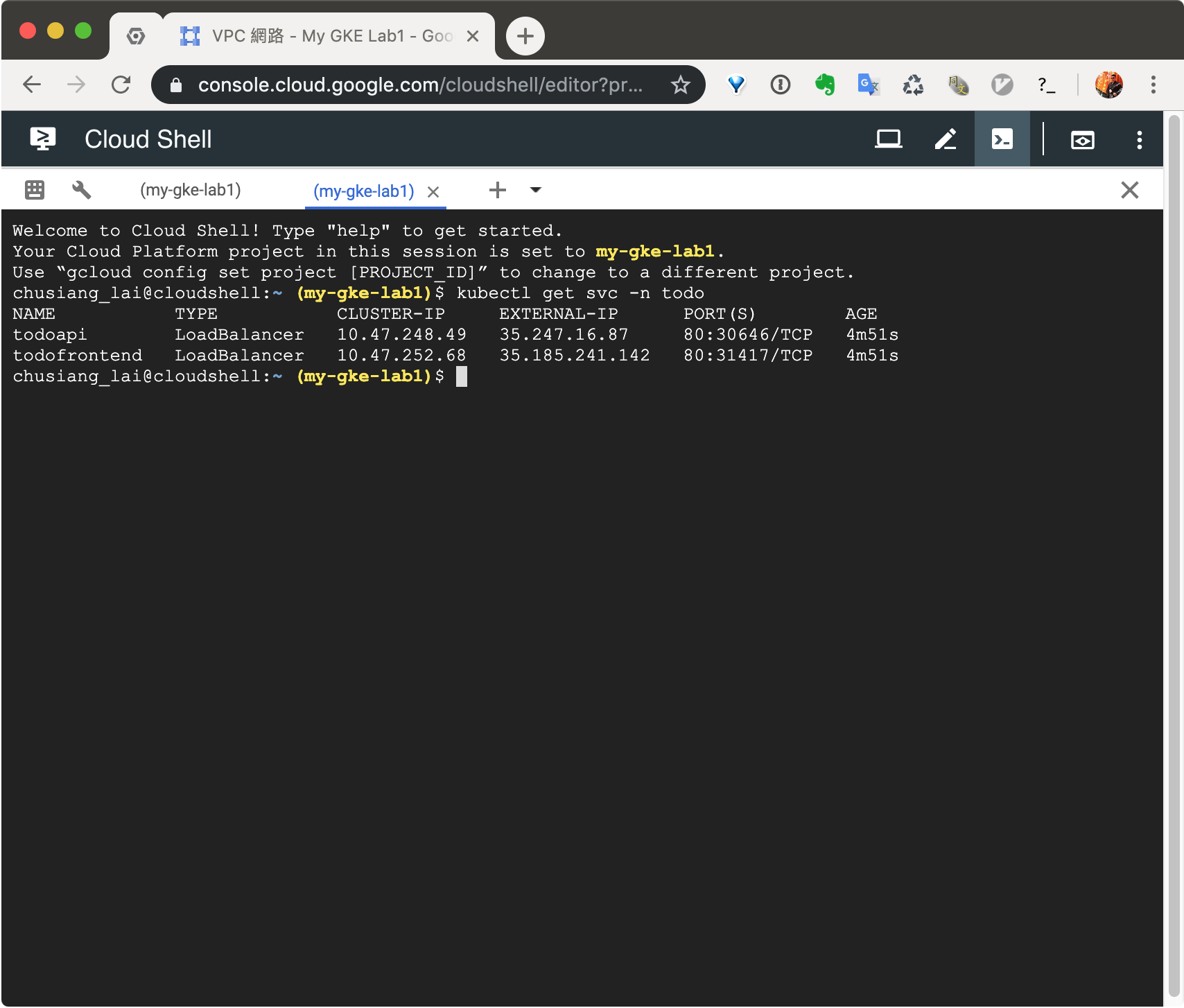 chusiang_lai@cloudshell:~ (my-gke-lab1)$ gcloud config set project my-gke-lab1 Updated property [core/project]. -