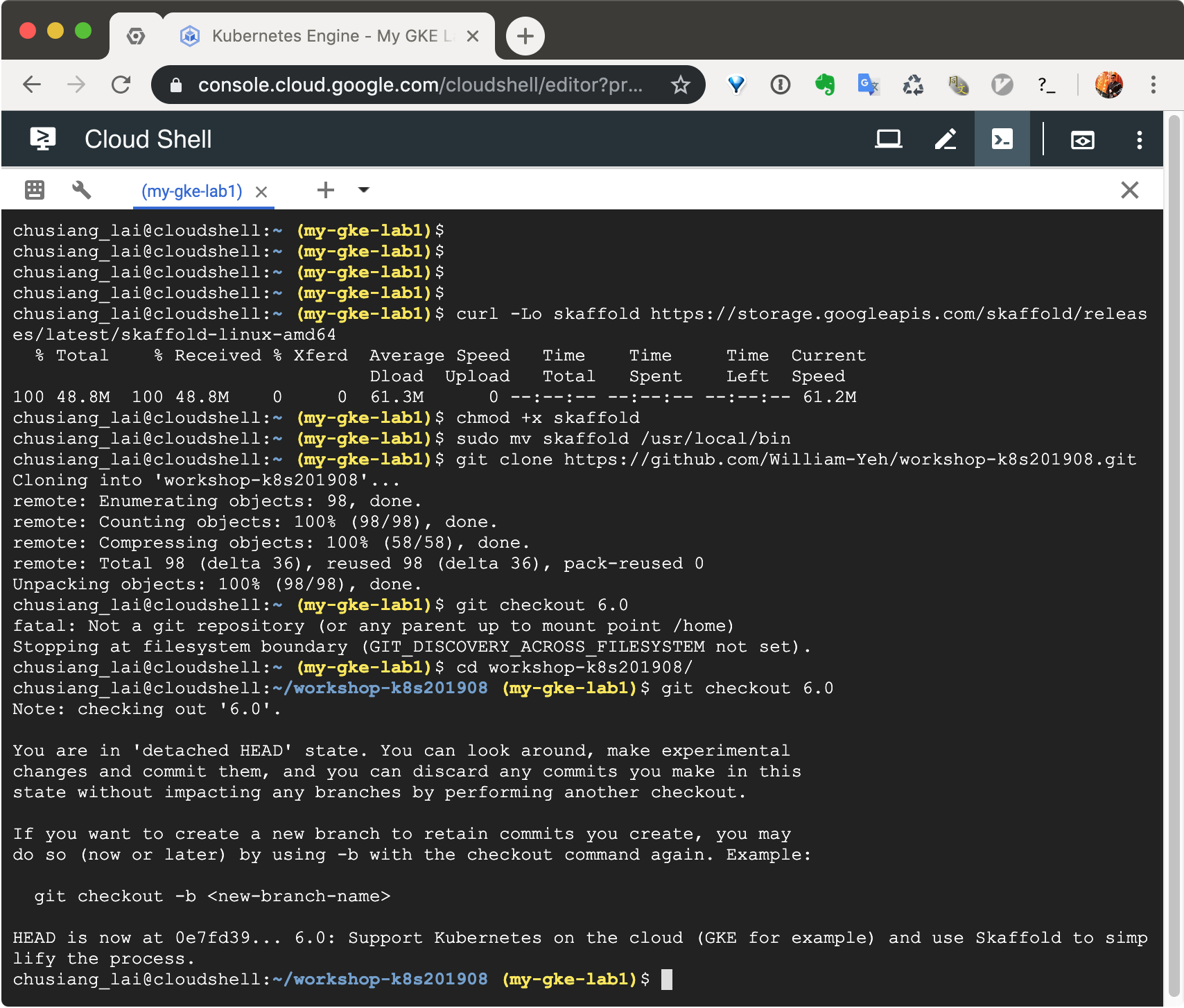 6.0tag.[ jonny@unicorn ~/workshop-k8s201908 ] ((HEAD detached at 5.0)) - 16:32 (cmd)$ git checkout 6.0 Previous HEAD position was 47f84f0 5.0: Support ConfigMap and naming convention. HEAD is now at 0e7fd39 6.0: Support Kubernetes on the cloud (GKE for example) and use Skaffold to simplify the process. -