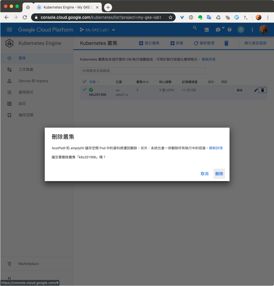 當看到 k8s201908 cluster 的狀態為 RUNNING 時,即代表 GKE 服務 Setup 成功,且正常執行!