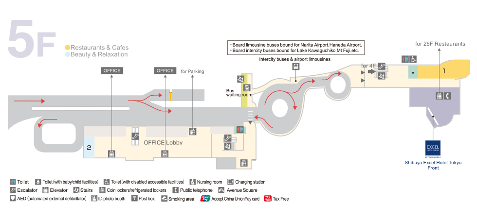 Shibuya Mark City is located directly across from Shibuya Station. From the JR Lines or Subways, follow the signs towards the Keio Inokashira Line (京王井の頭線). If you arrive by the Keio Inokashira Line, you will already be in the right building.