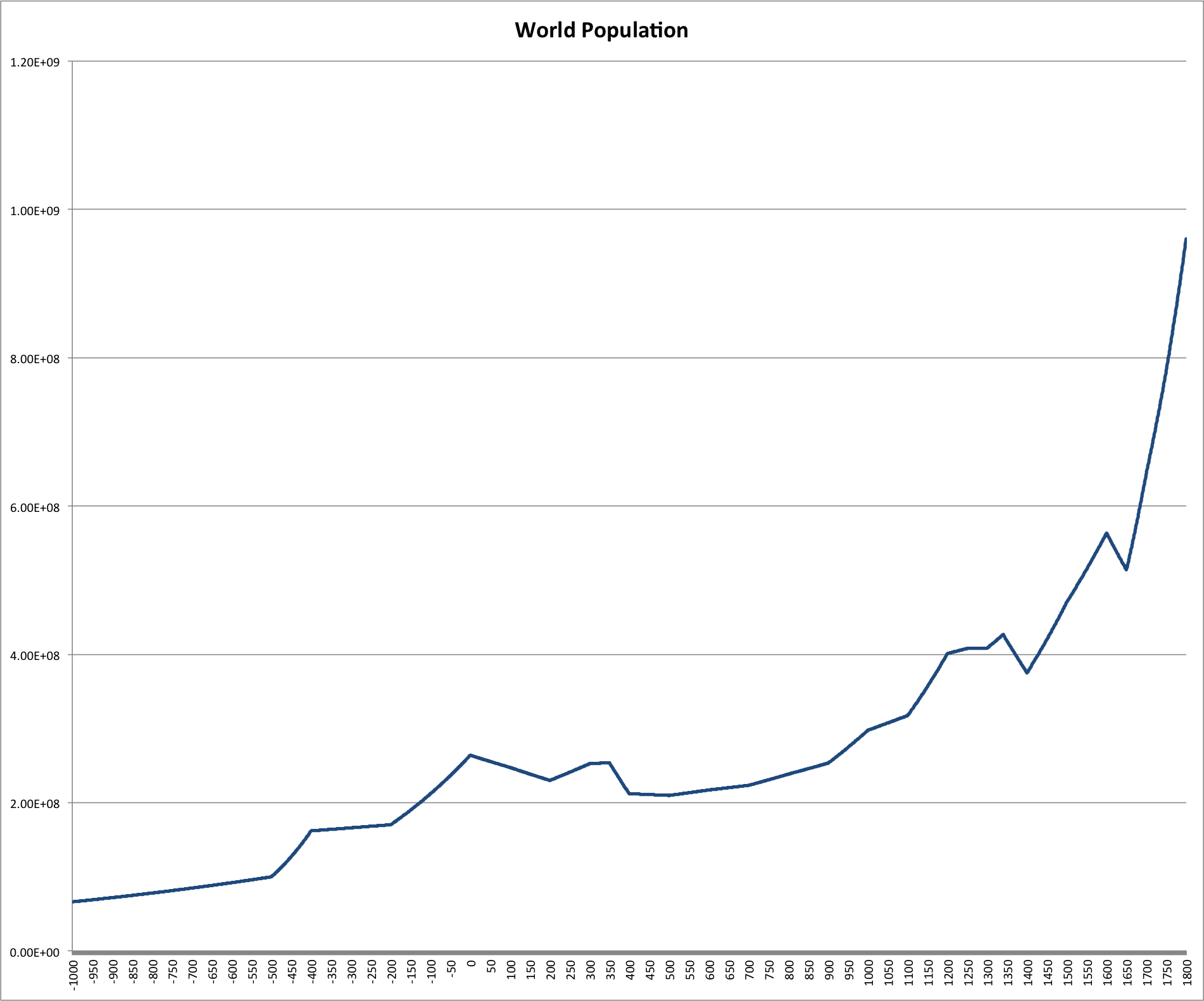 Interestingly, world population isn't known to any particular accuracy (there are estimates but we don't know how accurate they are) prior to 1950! Here's a graph showing an amalgam of available estimates 1000 BC to 1800 AD