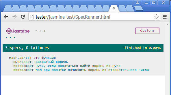 Вот результат выполнения этих тестов в браузере, где Jasmine выводит список пройденных проверок: