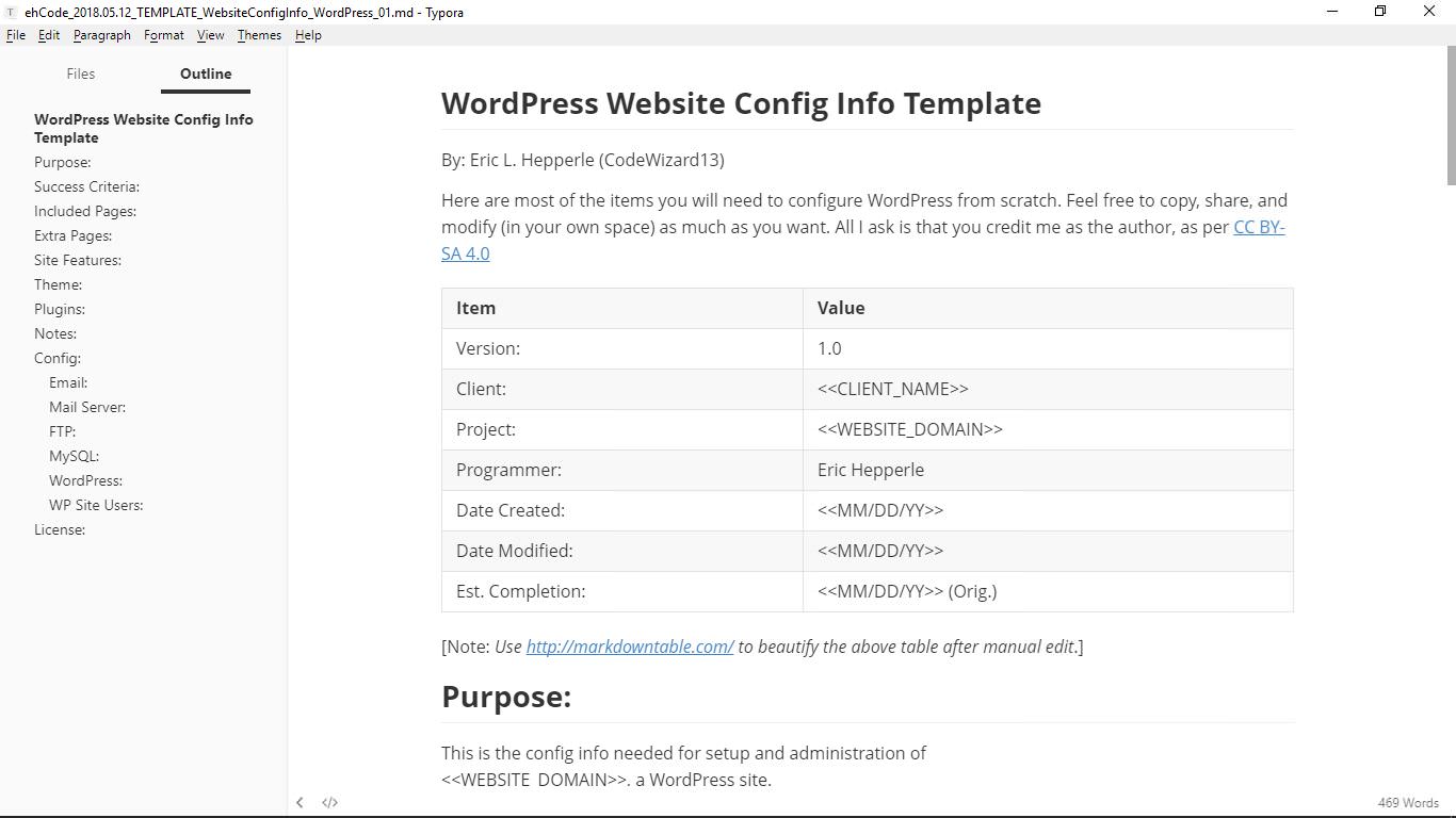GitHub Gist for WordPress Website Config Info Template (User: codewizard13).