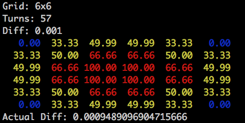 The goal is to determine how many turns it takes until not a single cell has changes more than 0.001 degrees and then print out the grid.