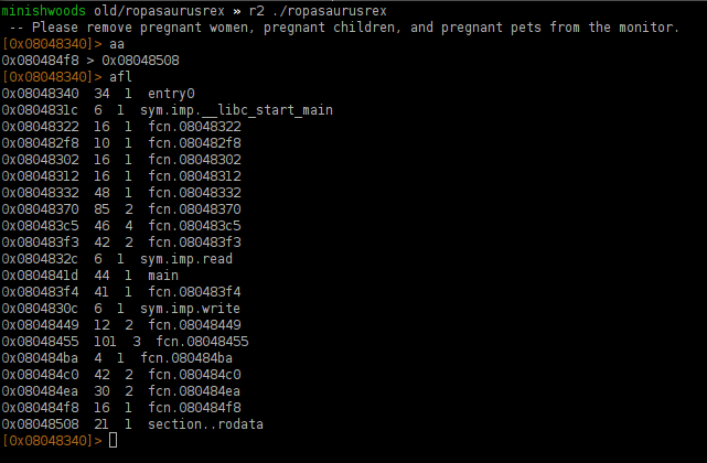 Open up ropasaurusrex in r2 and call analyze on the binary. We can list the functions with "afl"