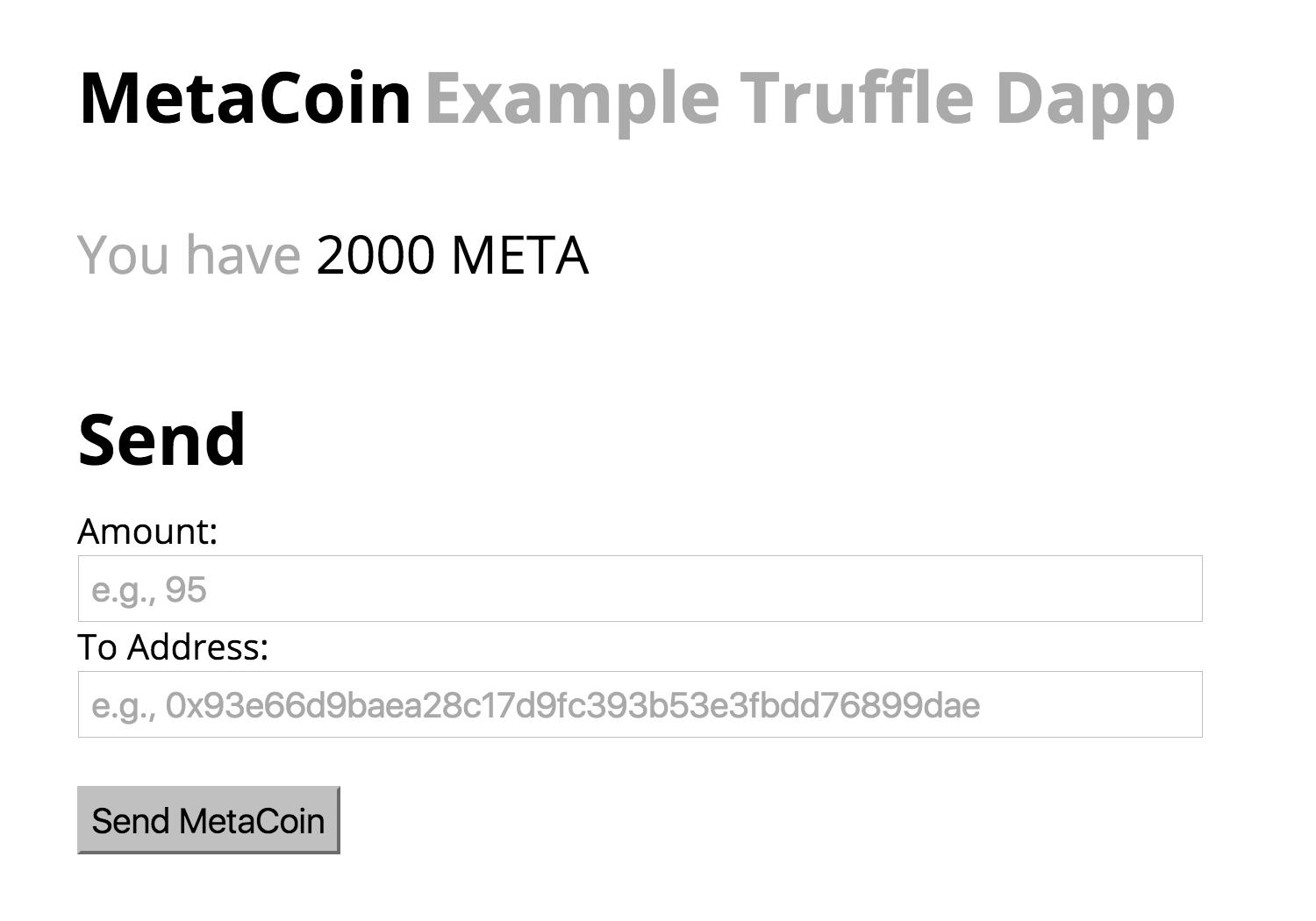 Paste the address into the Dapp window, along with how much Metacoin you'd like to send, and hit send!