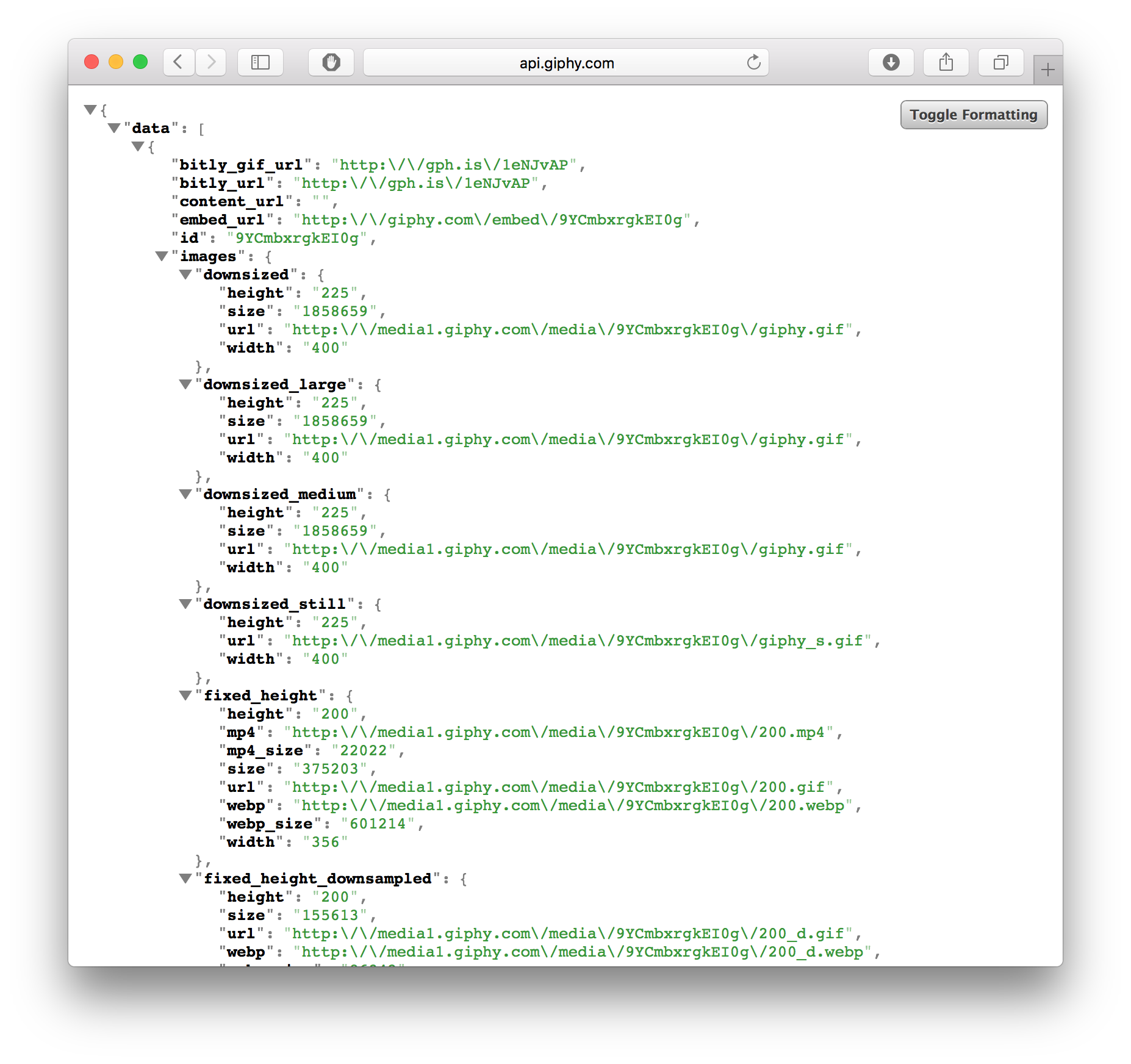 Formatted JSON from the Giphy API