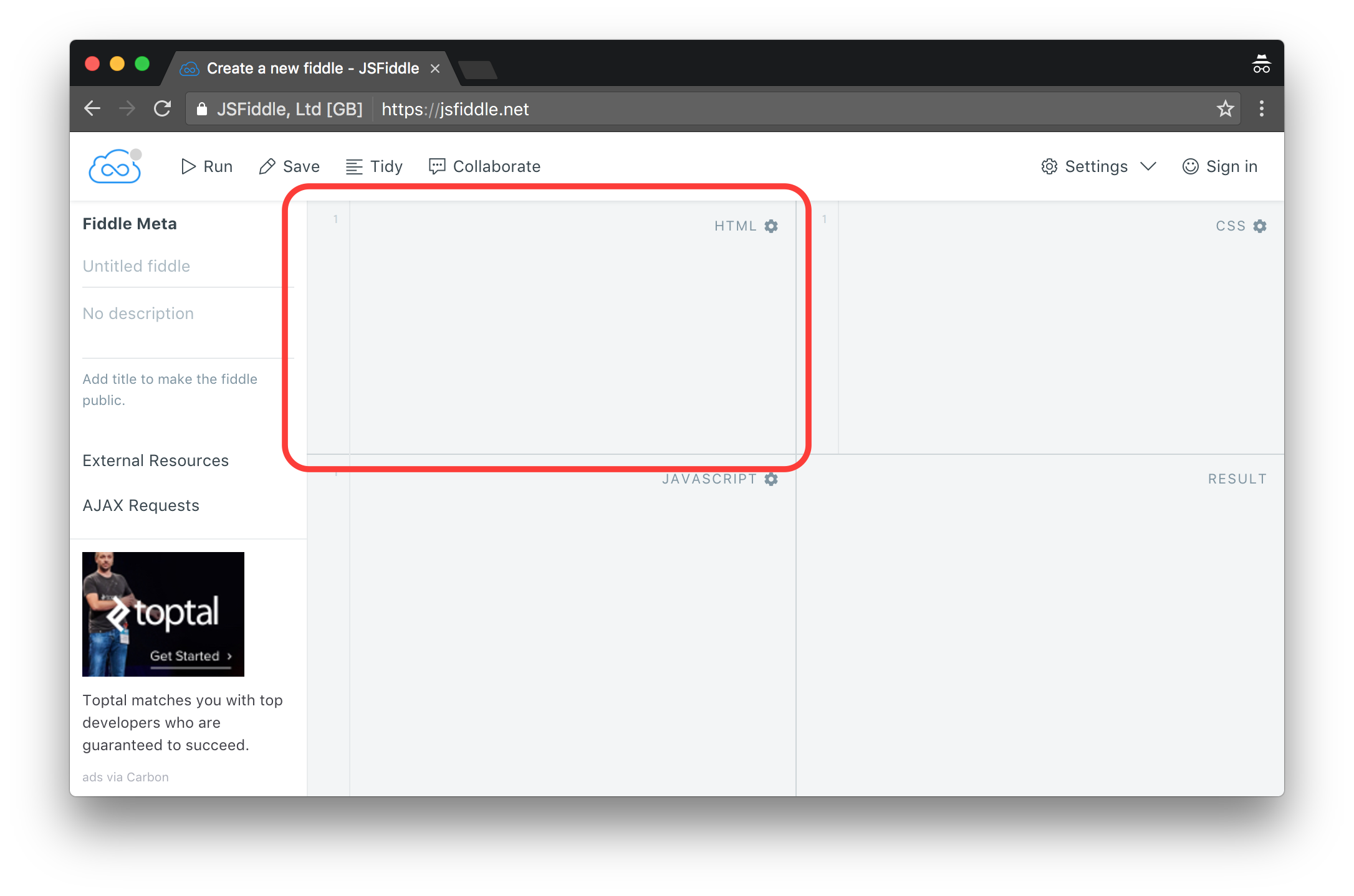 We're going to be using a website called JSFiddle to create our own emojis. First we need to open JSFiddle in a new tab (right click and open in new tab) http://jsfiddle.net/