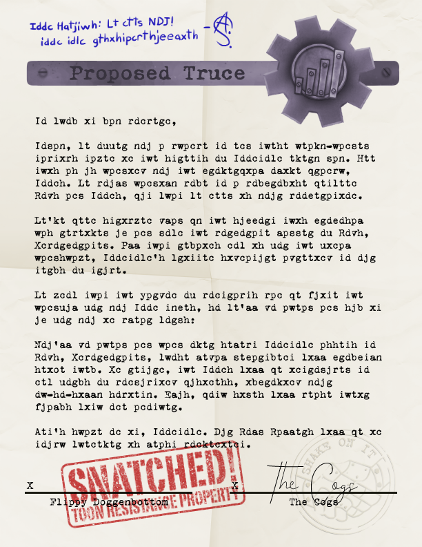 Once toons have defeated the Foreman and left the factory, Samantha Spade sends a whisper to the toons: