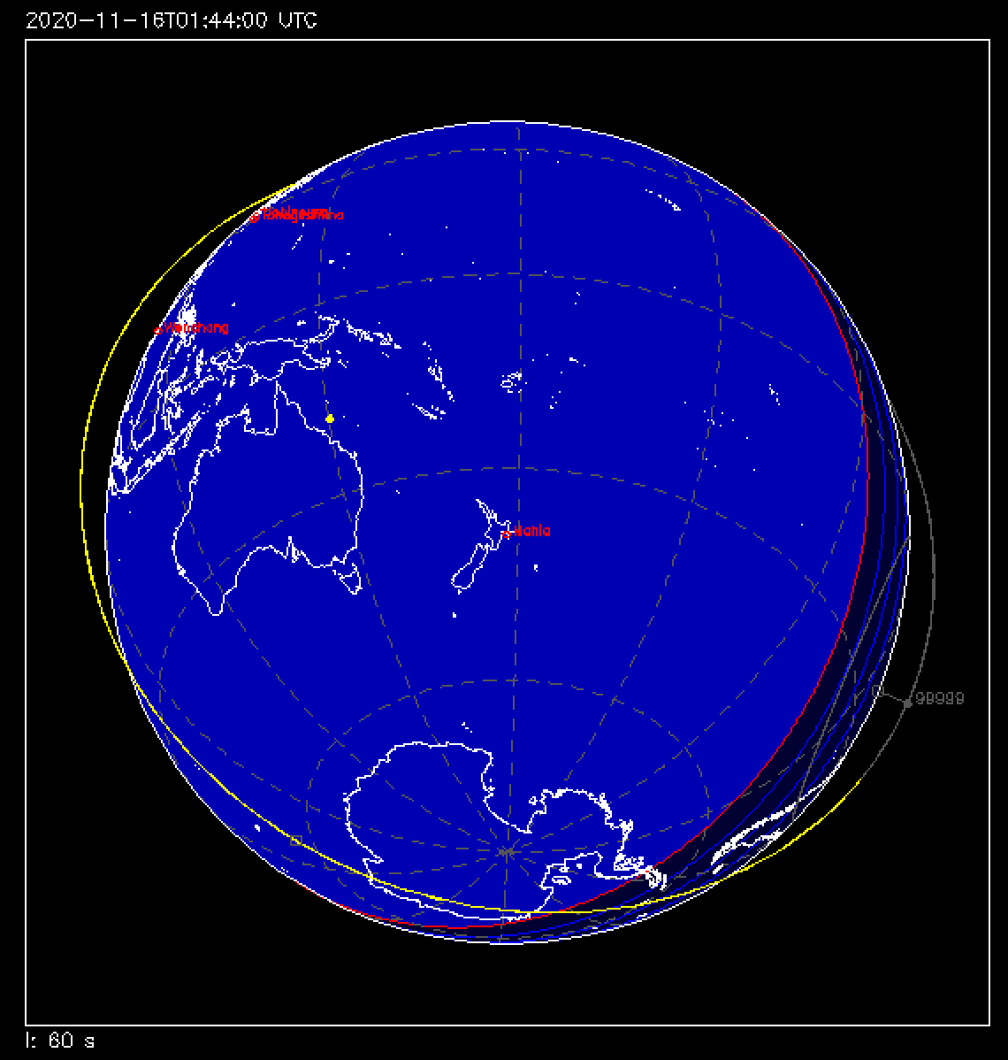 99999- Satellite ID2020-11-16T03:19:45- Rise time (YYYY-MM-DDTHH:MM:SS)55/ 1- Rise Azimuth and Elevation (Az/ El)03:24:18- Time of closest approach111/14- Azimuth/Elevation of closest approach.03:28:54- Set time.167/ 1- Azimuth/Elevation of set.