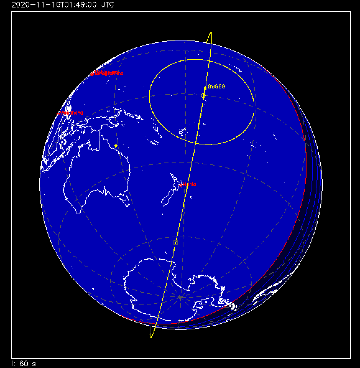 Note that whenever you step in time like this, satorbit will reload the TLE file. We're going to make use of this. Advance so the time reads 2020-11-16T01:49:00.