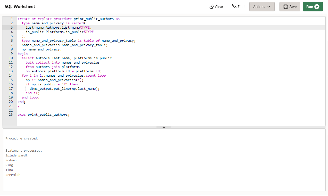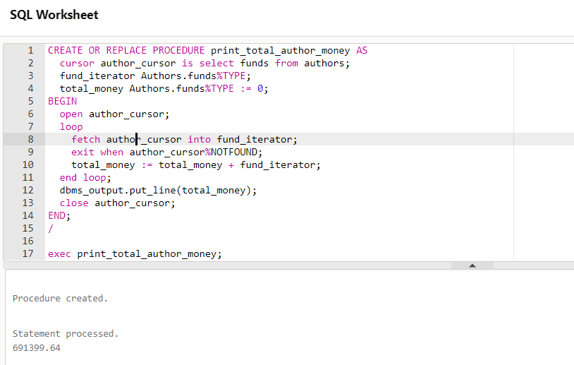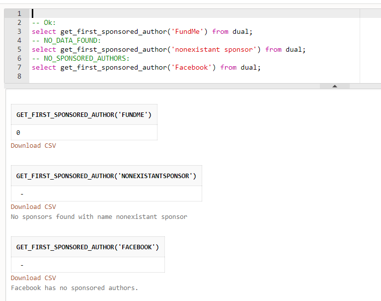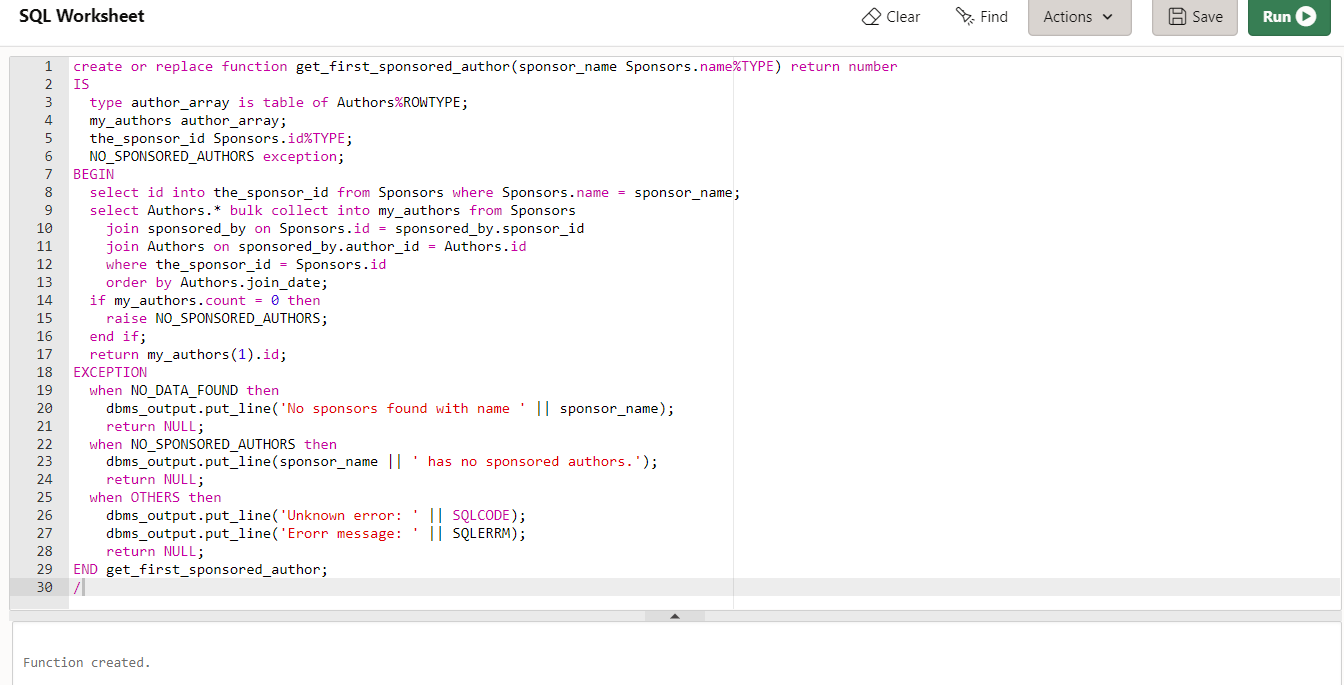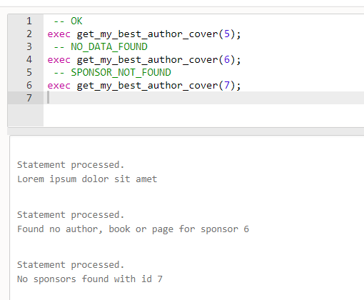 Am tratat exceptiile NO_DATA_FOUND si o exceptie cusotm NO_SPONSORED_AUTHORS.