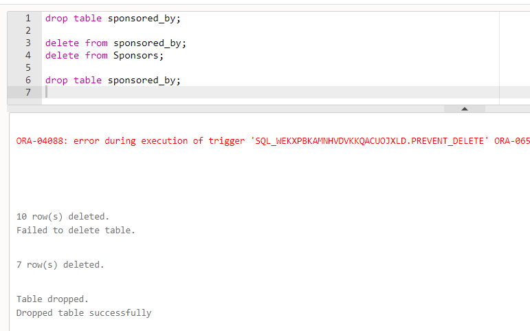 - Întâi am încercat sa dau drop la tabelul de legătură sponsored_by (ceea ce a dat eroare datorită triggerului). Acest tabel nu are alte dependințe.