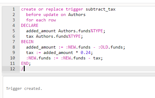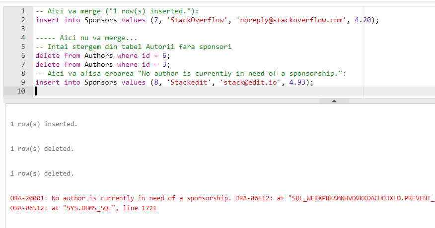 Nota: Nu am reușit să îl fac să și afișeze mesajul de eroare. Triggerul funcționeaza corect în afară de mesajele de eroare.