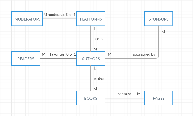 Aceasta este baza de date pentru o aplicație fictivă de gestionare a cărților și sponsorilor pentru autori, integrată pe mai multe platforme. Fiecare autor poate crea mai multe cărți (fiecare carte conține mai multe pagini) si poate fi sponsorizat de mai mulți sponsori. Fiecare autor provine de pe o singura platforma.