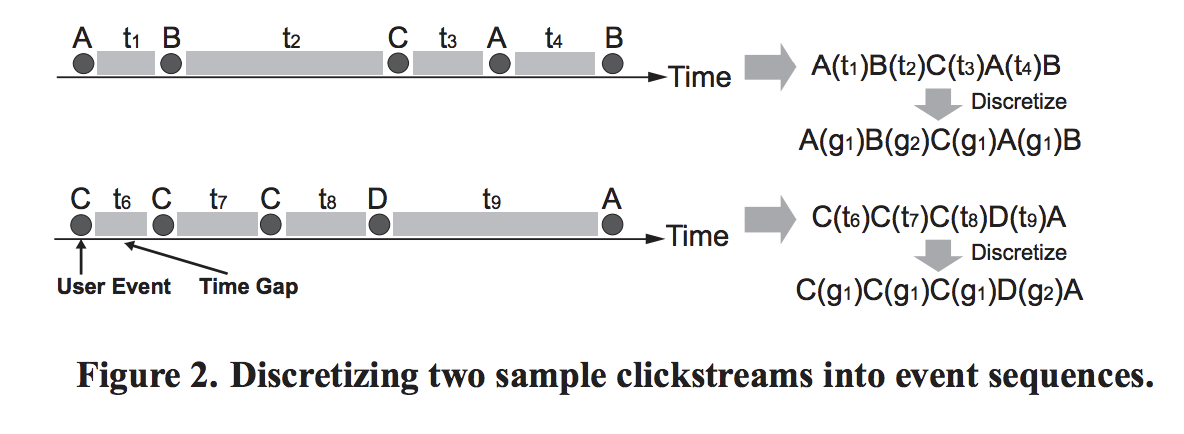 2. These five discrete time buckets: <1s, [1s, 1min],(1min, 1h],(1h, 1day], > 1day, represented by g1, g2, g3, g4 and g5, respectively. Using these synbol to compose a clickstream,也就是本文的inputdata: clickstream