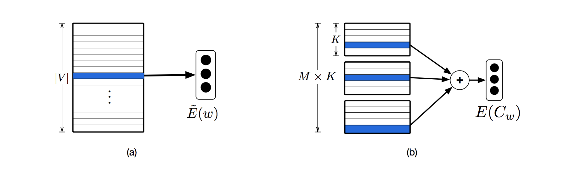 尺寸是V*K,任意一個單字,會被mapping到K個dimension中的一個