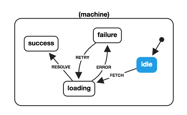 machinedefinition as a JavaScript object with the following properties:initial- the initial state of the machine (e.g.,"idle")states- a mapping of states to "transition objects" with theonproperty:on- a mapping of events to next states (e.g.,FETCH: "loading")