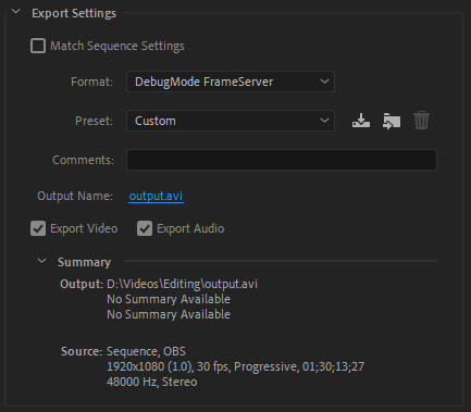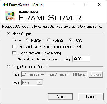The FrameServer setup window will appear. Set the "Format" in "Video Output" to