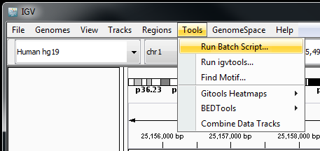 The IGV batch script is run within IGV. Load the bam, vcf, and BED files that you want to visualize.