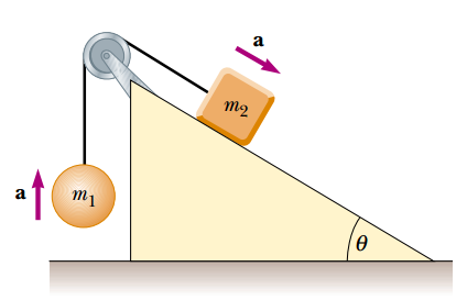 A ball of mass m1 and a block of mass m2 are attached by a lightweight cord that passes over a frictionless pulley of negligible mass, as shown in the figure below. The block lies on a frictionless incline of angle θ. Find the magnitude of the acceleration of the two objects and the tension in the cord.