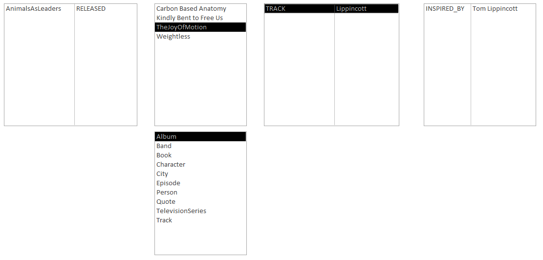 Now I've selected the Album label and TheJoyOfMotion node. The relationship lists show that AnimalsAsLeaders RELEASED this album, that Lippincott is a TRACK on this album, and that this track was inspired by Tom Lippincott.