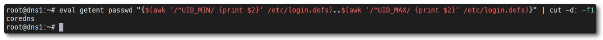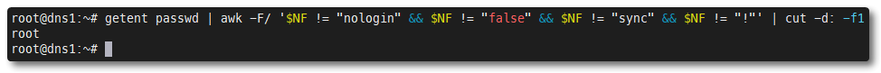 eval getent passwd "{$(awk '/^UID_MIN/ {print $2}' /etc/login.defs)..$(awk '/^UID_MAX/ {print $2}' /etc/login.defs)}" | cut -d: -f1getent group | grep 'x:0:' /etc/passwd | cut -d: -f1getent group root wheel adm admin | cut -d: -f4getent passwd | awk -F/ '$NF != "nologin" && $NF != "false" && $NF != "sync" && $NF != "!"' | cut -d: -f1Time to kick and lock any users that shouldn't be logged into the system. If there's any accounts you're not sure about, lock them out anyway. You can always undo your own damage later. Assume all accounts that are not you are admins with malicious intent, even if you know who they are.