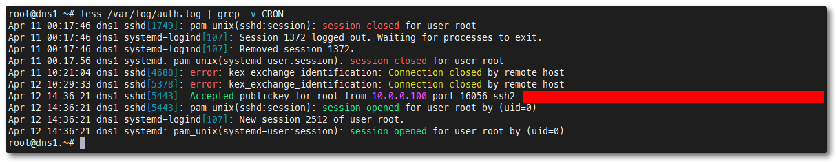 less /var/log/auth.log | grep -v CRONRedhat-based systems.