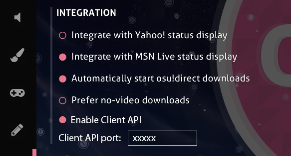 This is a proposal for osu! client side API for third-party applications. The API is designed to provide information as well as to allow interaction with the osu! client.