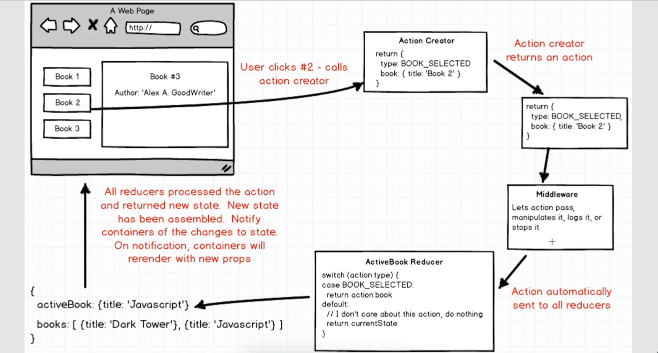 export default connect(mapStateToProps)(BookList);Any event (user triggered or otherwise) can trigger a call of an Action Creator which returns an Action object