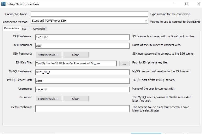 - MySQL Workbench: Here is a screenshot showing how you would configure Warden to connect to a project named