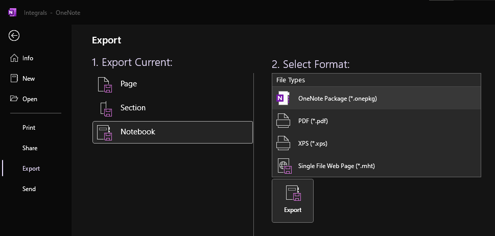 Notebookto export the current notebook and then pick the output format. Personally, I picked the.onepkgformat. This is the best format if you want to view or edit a notebook OneNote in the future. - Press the export button and pick an output location. Wait. It may take a few minutes for large notebooks.