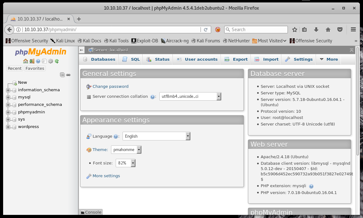 If we get phpmyadmin database access, we might be able to find some credentials to login somewhere else, or drop in some kind of reverse shell. If we get Wordpress admin access, we can also spawn a reverse shell pretty easily.