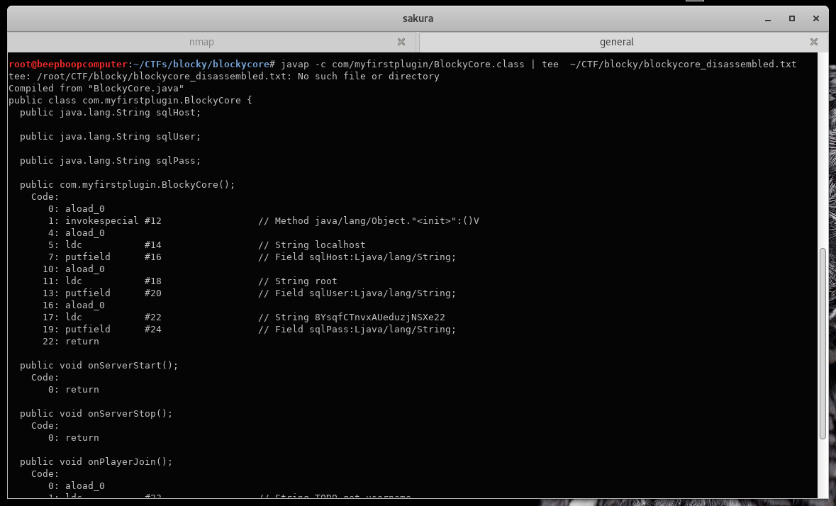 javap -c com/myfirstplugin/BlockyCore.class | tee ~/CTF/blocky/blockycore_disassembled.txt