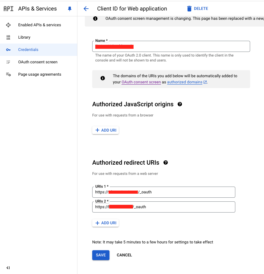 Click "Create Credentials" > "OAuth client ID". Select "Web Application", fill in the name of your app, skip "Authorized JavaScript origins" and fill "Authorized redirect URIs" with all the domains you will allow authentication from, appended with the url-path (e.g. https://app.test.com/_oauth)