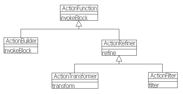 ActionFunction の具象インターフェイスとして ActionBuilder と ActionRefiner があり、 更に ActionRefiner の具象インターフェイスとして ActionTransformer と ActionFilter が存在しています。