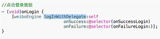 メソッド定義- logInWithDelegate:onSuccess:onFailureonSuccessとonFailureはコールバックのメソッドセレクターです。コールバックメソッド定義例: