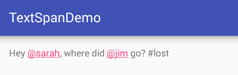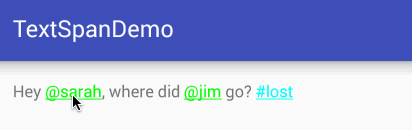 This Android utility is about making clickable colored spans within a TextView as painless and simple as possible! One common use case for this is building a Twitter or Facebook type app where different words in a message have different meanings and can be clicked to trigger an action. For example: