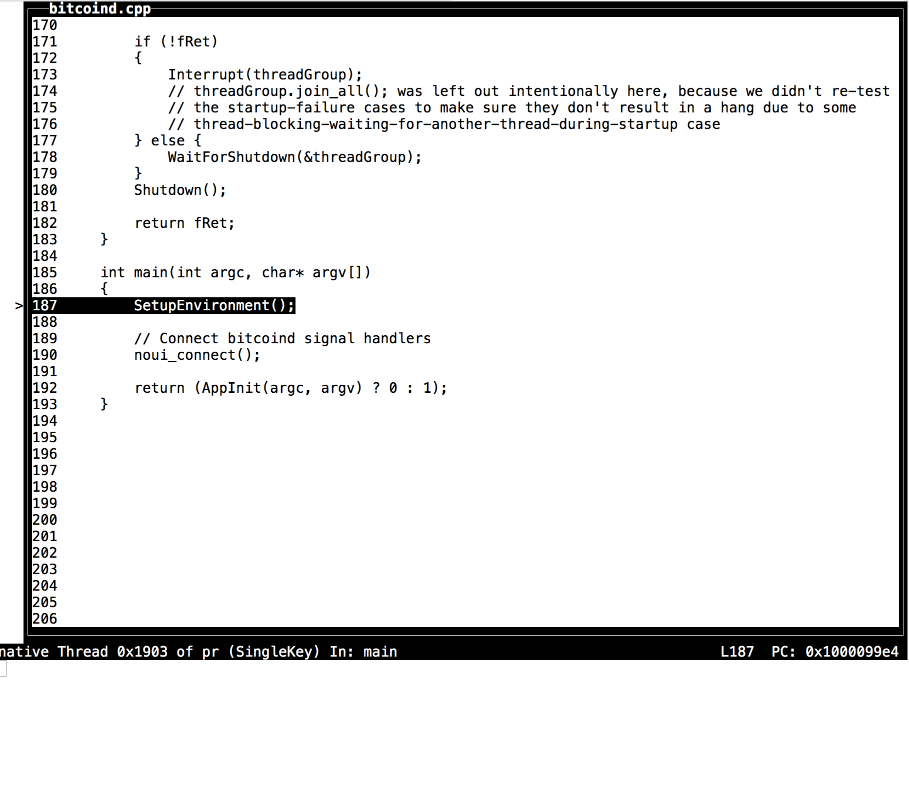 Temporary breakpoint 1 at 0x1000099e4: file bitcoind.cpp, line 187.