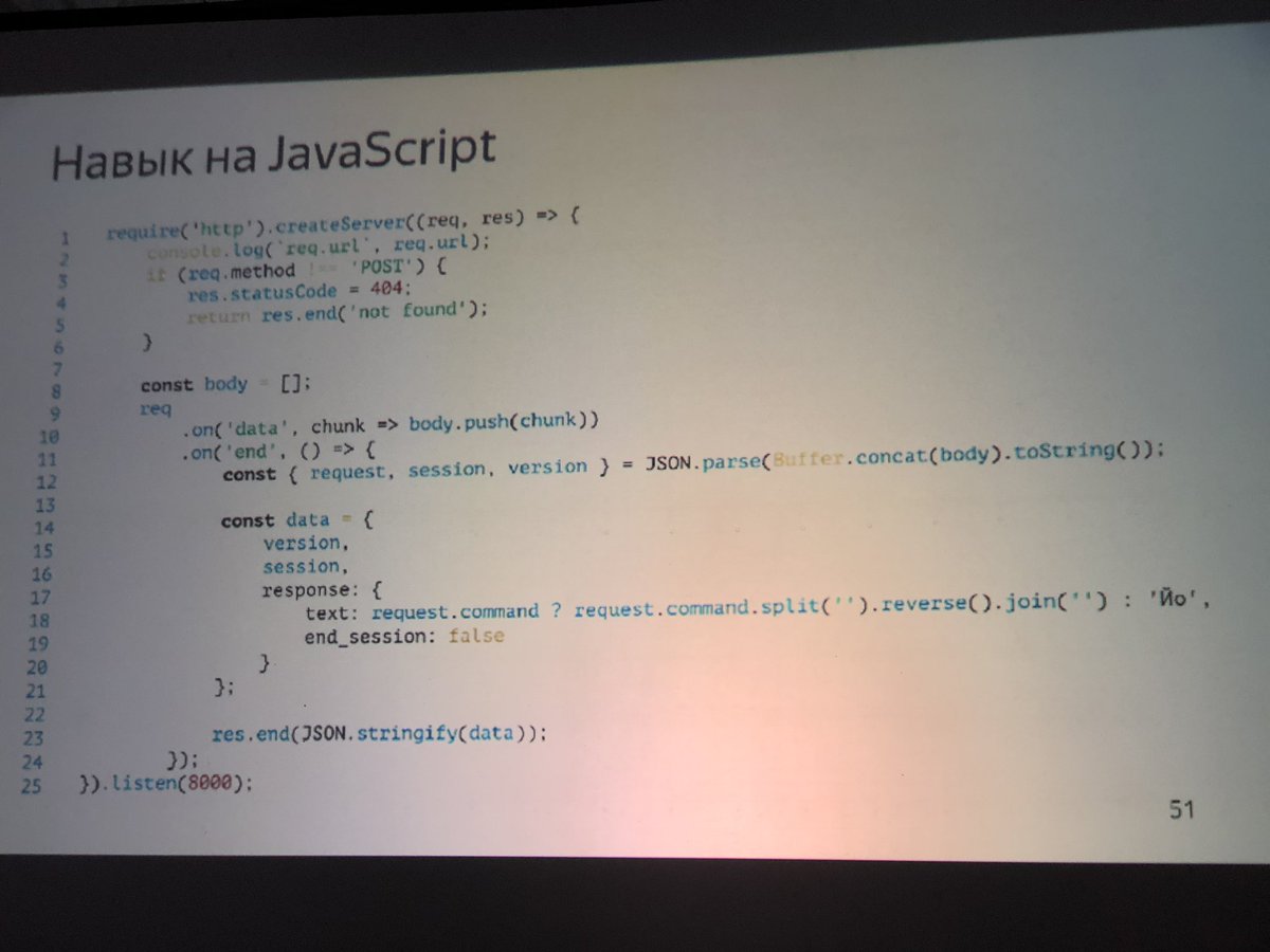 Навык для Алисы можно написать в 25 строчках JavaScript без единой дополнительной зависимости. pic.twitter.com/aF058tG7yR