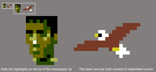 Use a limited palette- If you can't make a good sprite in 4 colors, using 40 colors isn't going to help. Using a small palette is especially good for beginners because it forces you to focus on pixel placement and the relationships between groups of pixels.