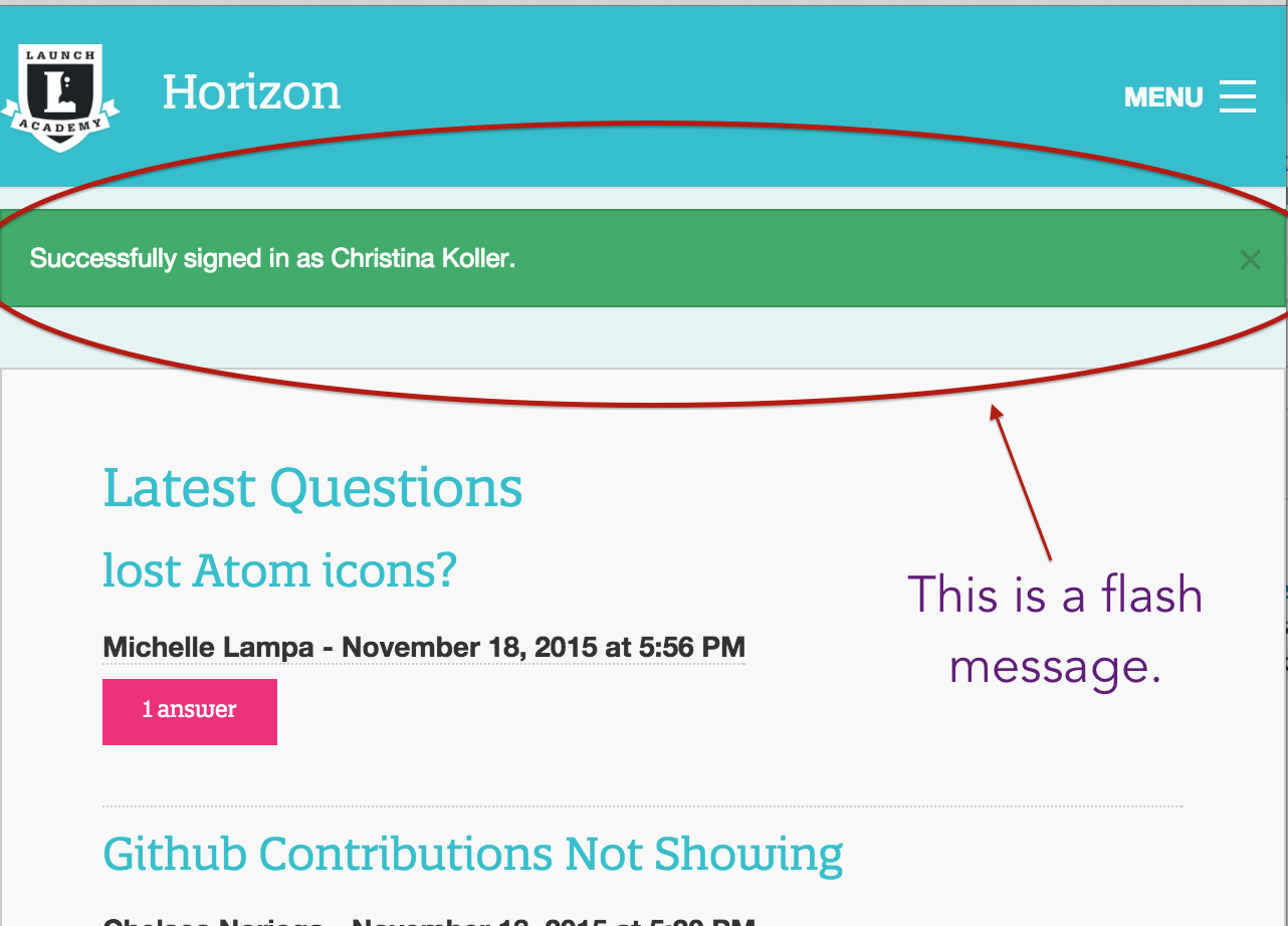 Sinatra Flash is an awesome gem that allows you to pop up little messages alerting your users of important things, via some simple code in your server.rb file. This is very useful for things like displaying error messages if the user has filled out a form wrong, or displaying "success" messages if the user did something successfully like sign in, sign out, or submit a form.
