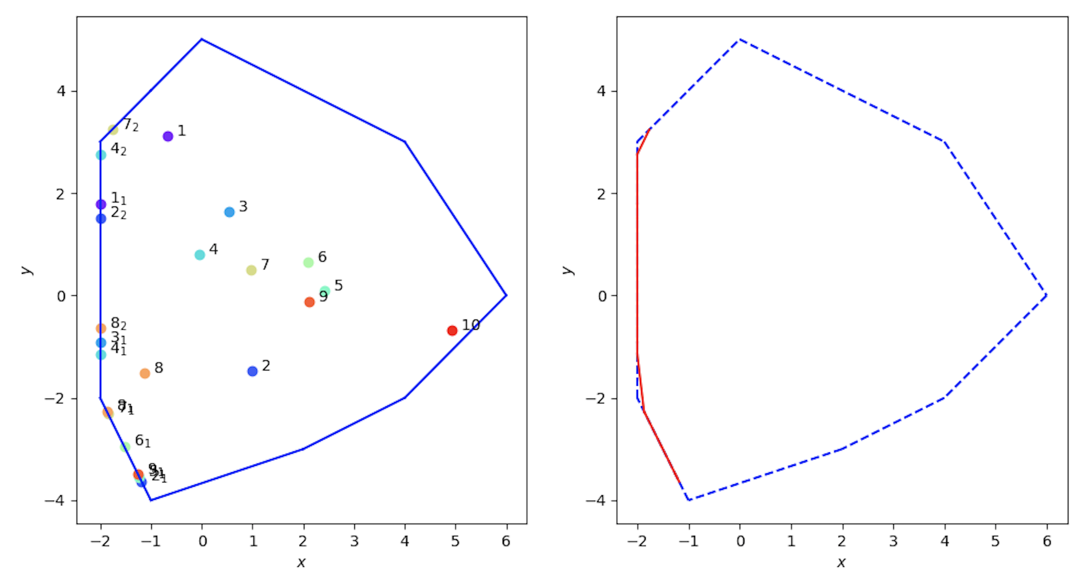 visualize(polygon, f1, f2, points, pareto, plot_bad=True, name="iter{}".format(iteration + 1))