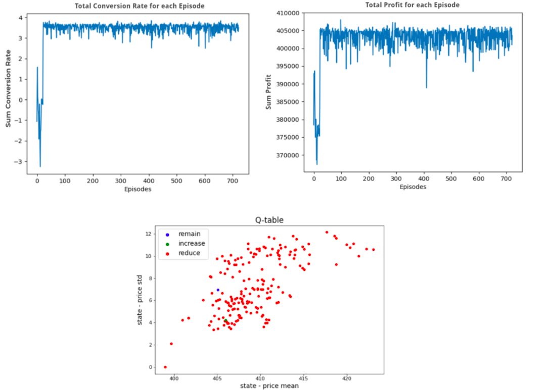 The previous figure shows that the peak of predicted profit is located at nearly 410 dollars. In the Q-table plot, we can see that most states with prices higher than 410 are suggested to reduce prices, and the increasing price suggestion takes place as prices being lower than 410, which meets our expectation.