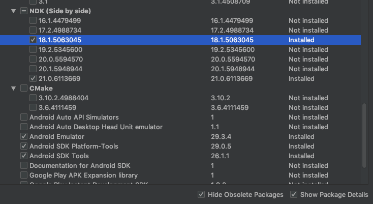 On the SDK Tools select Show Package Details and, under NDK (Side by side) select: 18.1.5063045