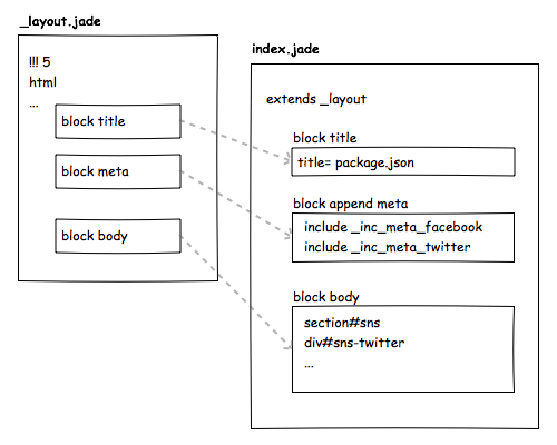 block append についても解説しましょう。_layout.jade の block meta では、続く 6 行目からインデントして meta 要素の定義をしています。そして index.jade 4 行目で block append meta が _layout.jade の block meta を読み込んでいます。