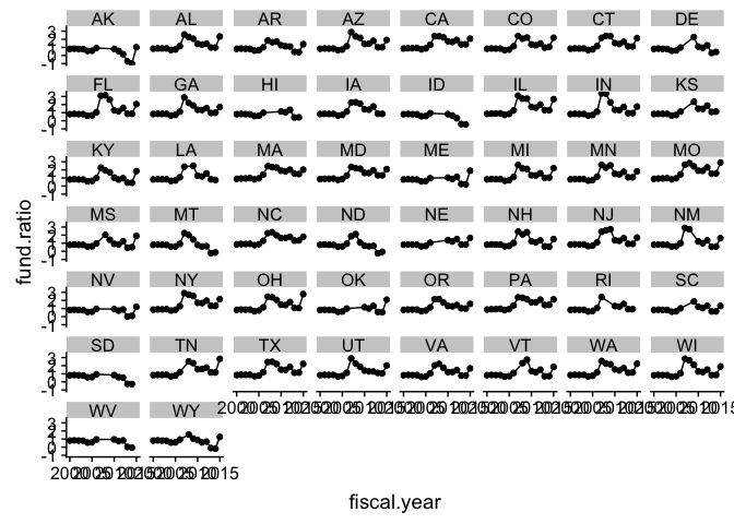 | ggplot(combined_funds, aes(fiscal.year, fund.ratio)) + | |