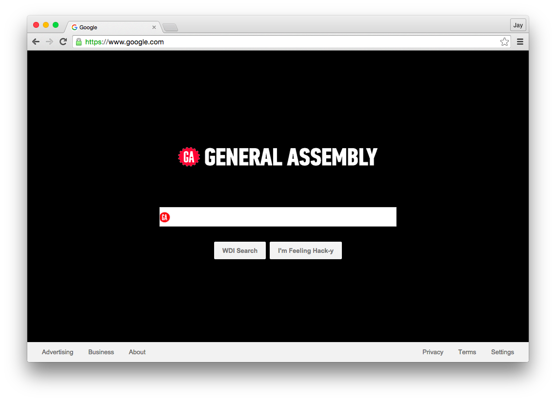 The General Assembly large logo can be sourced from the General Assembly homepage and the smaller logo, in the search bar, will have to be found through Google. Remember, don't refresh the page, otherwise you'll lose all your work modifying the DOM.