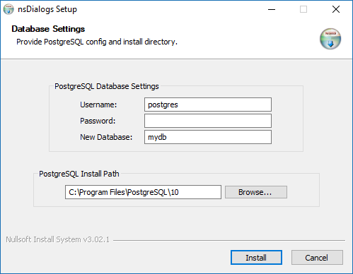 | !insertmacro MUI_HEADER_TEXT "Database Settings" "Provide PostgreSQL config and install directory." | |