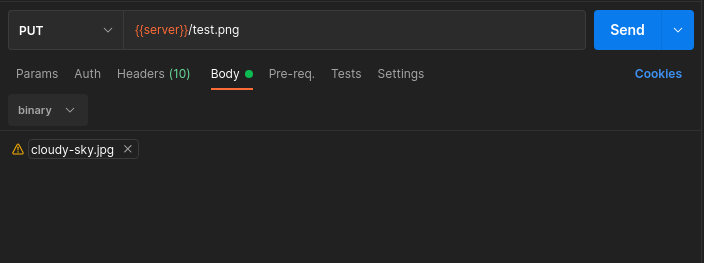 @MastalerzKamil Yes, there's a way to test it, it's very simple, in Postman you must send a request of type Put to the endpoint /upload/filename.png, and then in the Body of the request mark the type as binary and then use the Select File button and select the file you want to upload to the API, see the image: